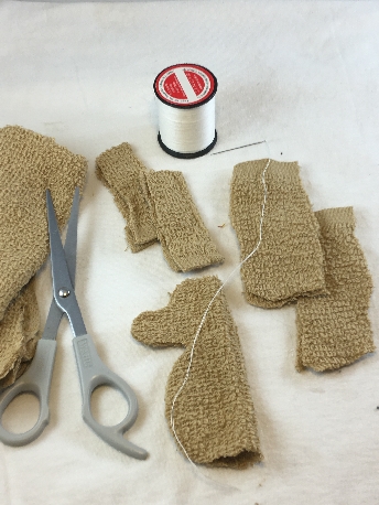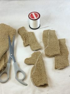 Find your sewing scissors, a needle, black and white thread, and some soft terry cloth. If you don’t have brown terry cloth, any upcycled washcloth will do the trick. Bears of all different colors can be part of your teddy bear family!