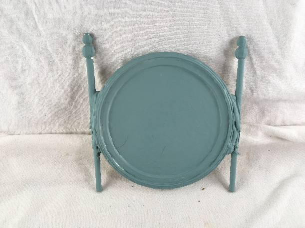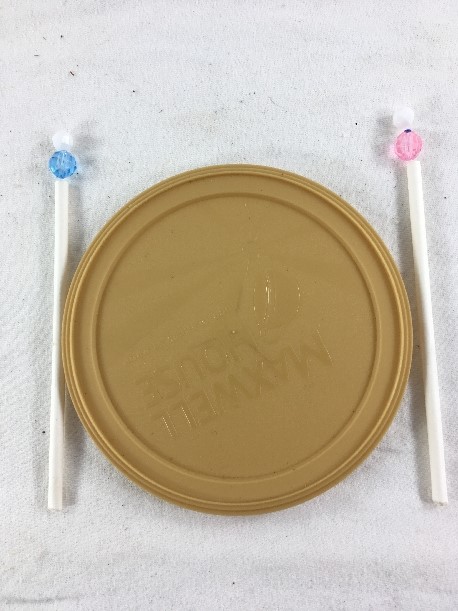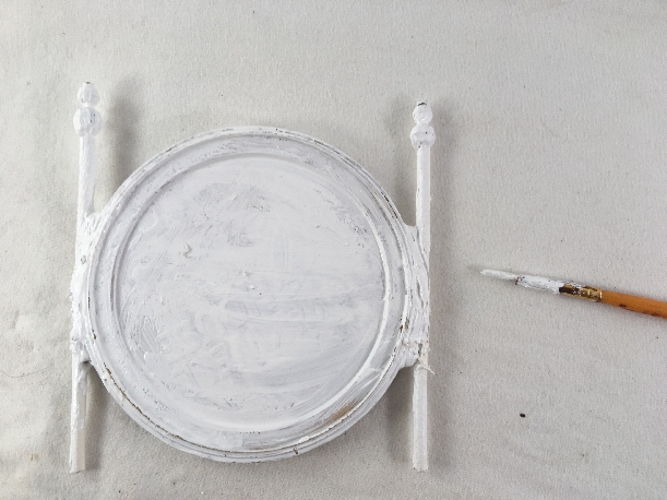 Find a nice lid, perhaps from a coffee can, along with 2 thin dowels that are just slightly longer than the lid. You’ll also need 2 round beads for bedknobs and a couple more large beads or gems for decoration, plus a hot glue gun. A paintbrushand paint color of your choice are the final supplies and then we’re ready to start! Glue. Using hot glue gun, attach dowels to sides of lid and attach beads on ends of dowels for decorative knobs.