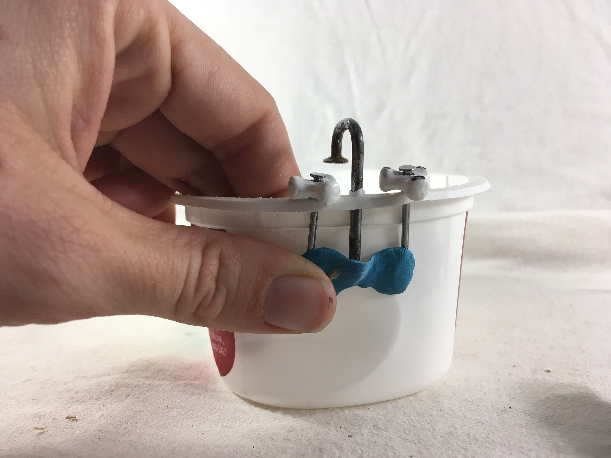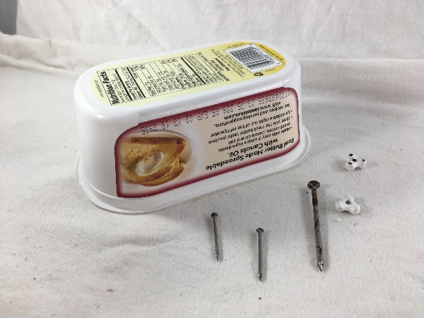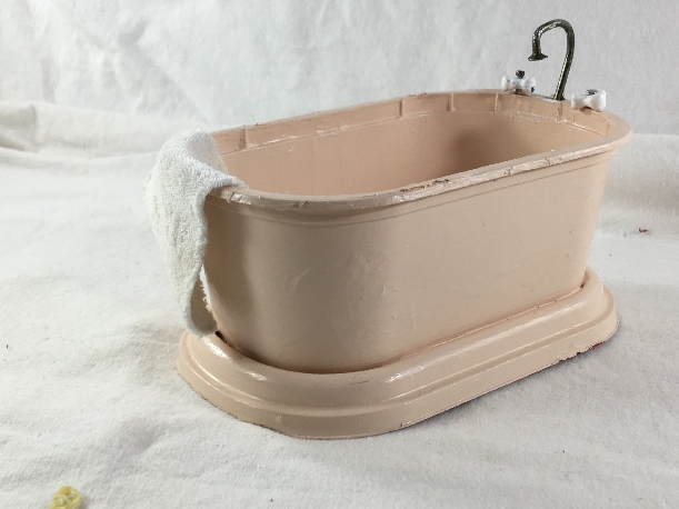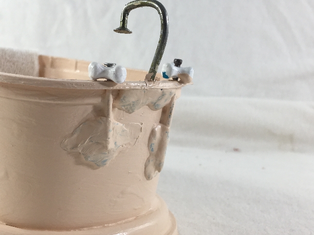 When you are doll-sized, you notice all the human supplies that can be repurposed for small folk. An oval butter tub works beautifully for a doll’s bathtub! Some scraps of terrycloth and scissors are all you need for making towels. You’ll use a large nail for the faucet along with wide pliers plus narrow pliers. And just like with our powder room sink, the knob handles come from 2 small nails and a pair of 3-sided beads. Grab some tacky putty, find some creamy paint and a paintbrush, and start dreaming of a bubble bath!