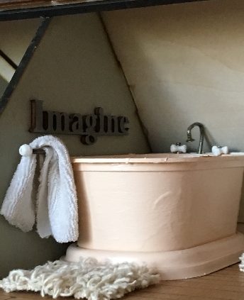 When you are doll-sized, you notice all the human supplies that can be repurposed for small folk. An oval butter tub works beautifully for a doll’s bathtub! Some scraps of terrycloth and scissors are all you need for making towels. You’ll use a large nail for the faucet along with wide pliers plus narrow pliers. And just like with our powder room sink, the knob handles come from 2 small nails and a pair of 3-sided beads. Grab some tacky putty, find some creamy paint and a paintbrush, and start dreaming of a bubble bath!